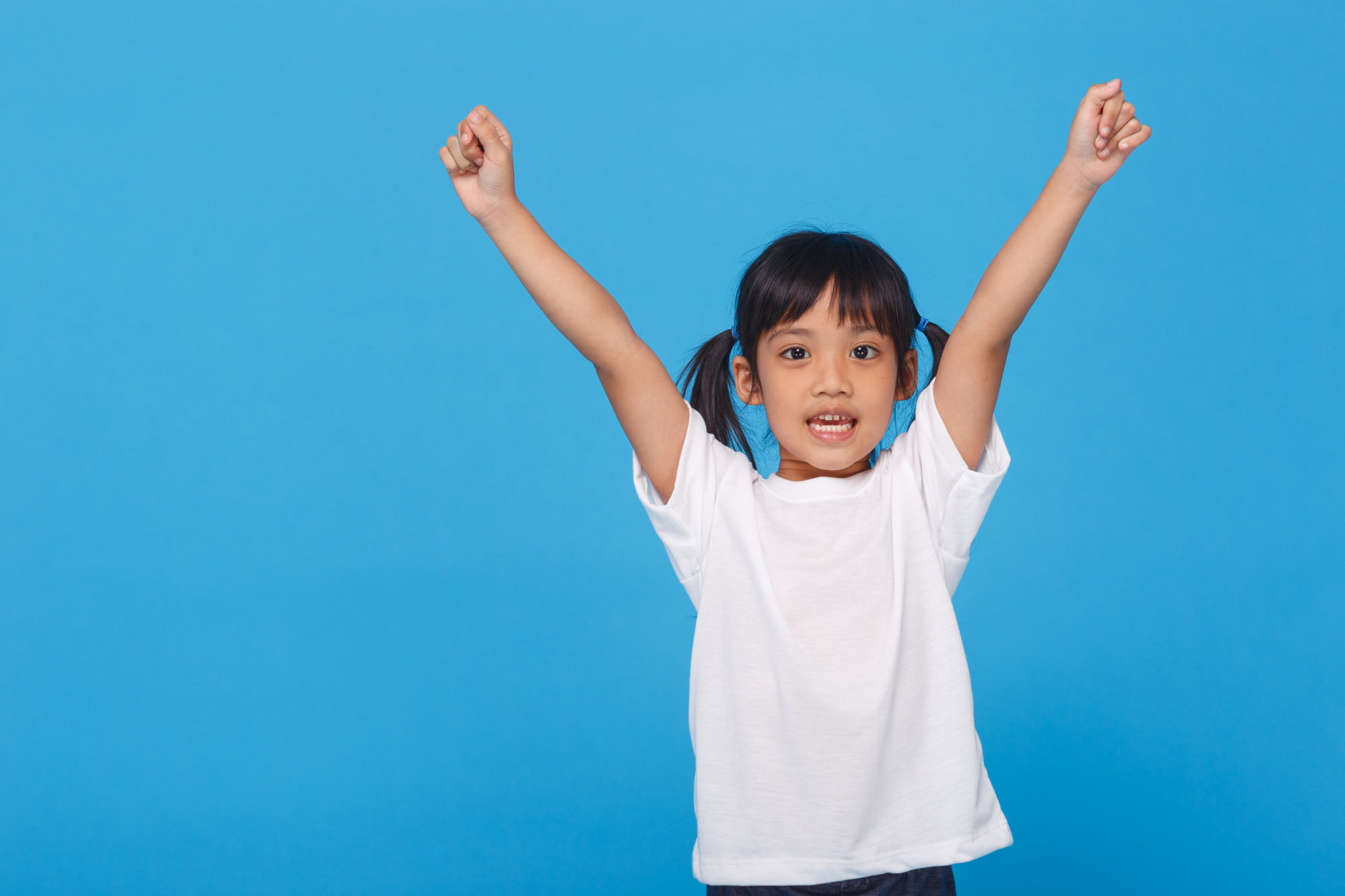 A young girl in a white t-shirt stands with raised arms against a solid blue background, showcasing the confidence gained from gentle laser dentistry at Lake Sammamish Kids Dentistry - Pediatric Dentist in Sammamish, WA.